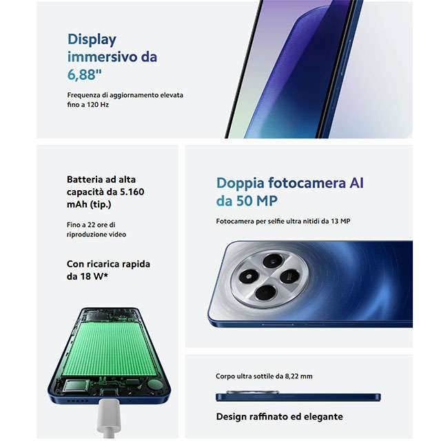 Il comparto hardware è basato sul processore Mediatek Helio G81-Ultra, affiancato da 8 GB di RAM e da 256 GB di memoria interna per l’archiviazione, espandibile tramite microSD. Queste specifiche tecniche assicurano fluidità con tutte le app, anche in multitasking, oltre che con i giochi. Lato software c’è il sistema operativo Android con interfaccia HyperOS e accesso alla piattaforma Google Play. Ottime anche le fotocamere: quella principale da 50 megapixel è supportata sul retro da un secondo sensore di profondità da 2 megapixel, mentre davanti c’è la selfie camera da 13 megapixel. A completare il quadro ci sono la batteria da 5.160 mAh con ricarica rapida da 18 W, una porta USB-C, il sensore di impronte digitali sul lato, il jack audio da 3,5 mm e la connettività Wi-Fi dual band e Bluetooth 5.4. Scopri di più sulla pagina dedicata.