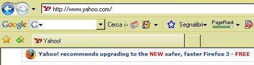 “Yahoo! raccomanda di installare il nuovo, più veloce e sicuro Firefox 3”: è questa la scritta che campeggia in alto sulla homepage del sito. A destra è posizionato un pulsante che permette di scaricare il software. Si tratta di un’edizione speciale di Firefox studiata ad hoc per Yahoo: è dotato di piena compatibilità con la Yahoo! Toolbar ed imposta il portale della grande Y come motore di ricerca predefinito.