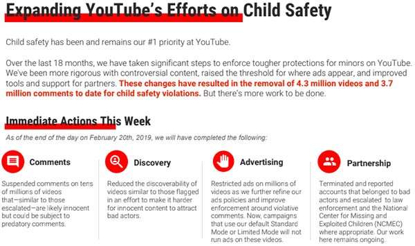 La piattaforma agisce nell’immediato su quattro fronti, andando a intervenire sulla disattivazione dei commenti, sugli algoritmi che consigliano la visione dei filmati, sulle modalità di visualizzazione dell’advertising e sulla collaborazione con autorità e associazioni attive nella tutela dei minori. Per quanto concerne invece il lungo periodo verranno introdotti sistemi per individuare in modo più rapido i commenti riconducibili alla sfera della pedofilia, nuove dinamiche di monetizzazione in grado di premiare solo i creatori di contenuti che rispettano un determinato standard di qualità, policy migliorate e una tecnologia in grado di impedire a chi ha già subito un ban di aprire un altro account.