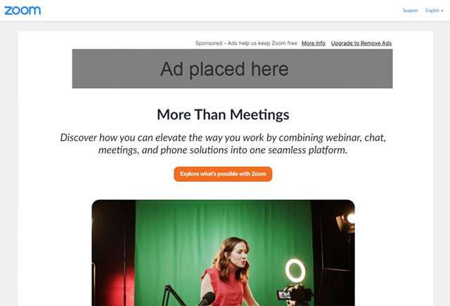 Per questo programma iniziale, le pubblicità compariranno solo nella pagina del browser che gli utenti vedono al termine dei loro meeting. Solo gli utenti con account Basic gratuito e in alcuni paesi saranno interessati, dopo essersi uniti a meeting organizzati da altri utenti con account Basic gratuito.